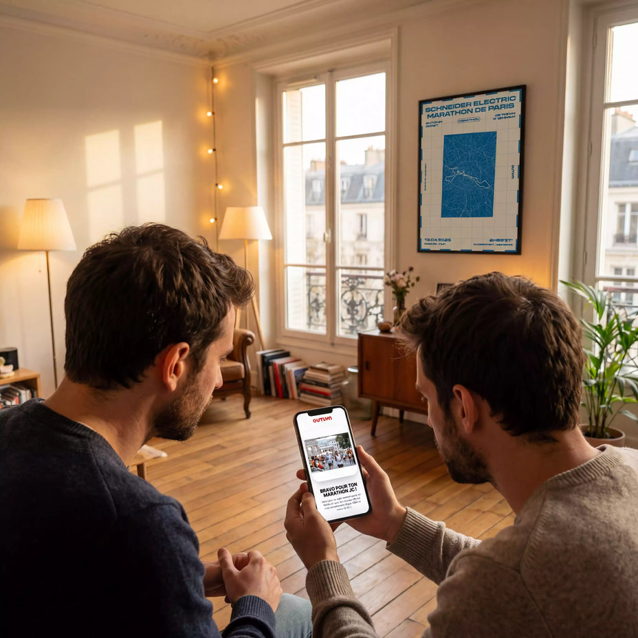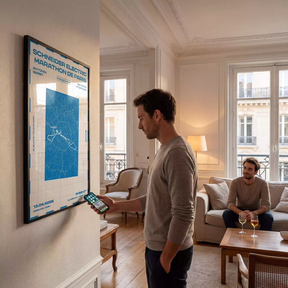 Intégré à l’affiche de manière invisible, un point de connexion permet, par un simple scan, de retrouver instantanément les souvenirs associés à l’exploit. Photos, message personnel, moments choisis : une page unique, accessible à tout moment, pour revivre l’effort et l’émotion.